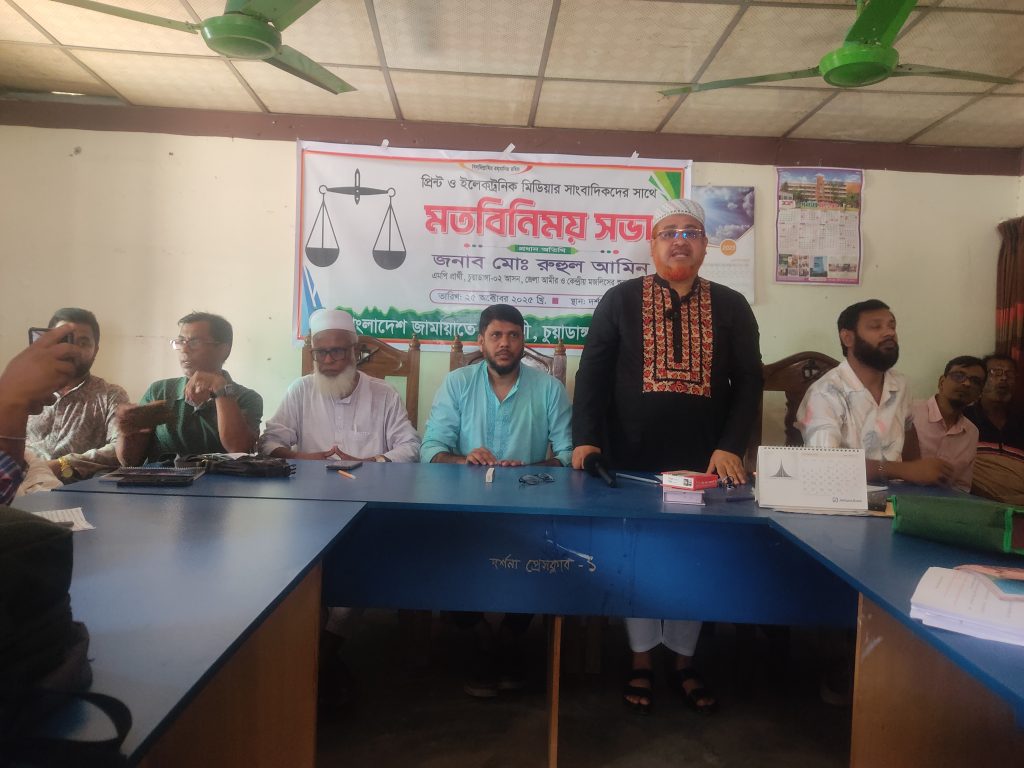 চুয়াডাঙ্গা জেলা জামায়াতে ইসলামের আমীর ও চুয়াডাঙ্গা-২ আসনের এমপি প্রার্থী রুহুল আমিন প্রিন্ট ও ইলেকট্রনিক মিডিয়ার সাংবাদিকদের সঙ্গে মতবিনিময় করেছেন। গতকাল শনিবার দুপুর ১২টার দিকে দর্শনা প্রেসক্লাবে এ সভা অনুষ্ঠিত হয়। পবিত্র কুরআন তেলাওয়তের মাধ্যমে মতবিনিময় সভা শুরু করা হয়। সভায় সভাপতিত্ব করেন দর্শনা থানা জামায়াতের সাধারণ সম্পাদক মাহবুবুর রহমান টুকু।