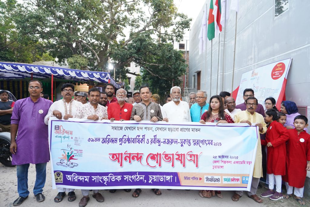 চুয়াডাঙ্গায় অরিন্দম সাংস্কৃতিক সংগঠনের ৩৯তম প্রতিষ্ঠাবার্ষিকী উপলক্ষে রবীন্দ্র ও নজরুল সুকান্ত স্মরণোৎসব উদযাপন করা হয়েছে। গতকাল শনিবার বিকাল ৫টায় জেলা শিল্পকলা একাডেমি চত্বরে এই অনুষ্ঠানটি আয়োজন করেন চুয়াডাঙ্গা অরিন্দম সাংস্কৃতিক সংগঠন।