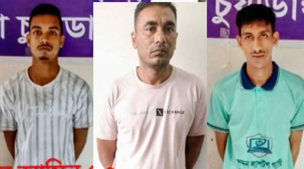আলমডাঙ্গা থানা পুলিশ রোয়াকুলি গ্রামের টেংরামারী মাঠে আলমডাঙ্গা টু চুয়াডাঙ্গা সড়কে ডাকাতি মামলার ঘটনার সাথে জড়িত ৩জন আসামীকে গ্রেফতার করেছে। গত ১৫ অক্টোবর আলমডাঙ্গা থানার আহসাননগর গ্রামের মৃত আকবার আলির ছেলে মিরাজুল ইসলাম(৪৫) মালয়েশিয়া হতে নিজ বাড়ীতে আসেন। গত ২৪ অক্টোবর অনুমানিক ভোর ৪টার দিকে প্রাইভেট কার যোগে বাদীর মা- সজিরন নেছা, বাদীর স্ত্রী ছোট ভাই- নাজমুল ইসলাম যশোরে আত্মীয়ের বাড়ীতে বেড়ানোর উদ্দেশ্যে নিজ বাড়ী হতে বাহির হয়ে আলমডাঙ্গা থানাধীন আলমডাঙ্গা টু চুয়াডাঙ্গা রোডে ০৭নং জেহালা ইউনিয়নের রোয়াকুলি গ্রামের টেংরামারি মাঠে জনৈক আসাদুল হক এর জমির পাশে পাঁকা রাস্তার উপর পৌছালে গাছের ডাল ফেলে বেরিকেড দেখে প্রাইভেট কার থামানো মাত্রই গামছা দিয়ে মুখ বাধা অজ্ঞাতনাম ০৩/০৪ জন আসামী ধারালো চাপাতি, রামদা নিয়ে গাড়ীটি ঘিরে ধরে বাদীর মায়ের স্বর্ণালঙ্কার, মোবাইল ফোন ও নগদ টাকা ছিনিয়ে নেয়। বর্ণিত ঘটনায় বাদী মিরাজুল ইসলামের লিখিত এজাহারের প্রেক্ষিতে গতকাল ভোর রাতে আলমডাঙ্গা থানার অফিসার ইনচার্জ মাসুদুর রহমান পিপিএম এর নেতৃত্বে পুলিশ পরিদর্শক(তদন্ত) মোঃ আজগর আলী সঙ্গীয় অফিসার ফোর্সসহ থানা এলাকায় বিশেষ অভিযান পরিচালনা করে তথ্য প্রযুক্তির সহায়তায় অত্র মামলার ঘটনার সাথে জড়িত আসামী আলমডাঙ্গা উপজেলার ডাউকি ইসলামপাড়া মজনুর রহমানের ছেলে আল আমিন হোসেন(২২), আহসান নগর গ্রামের আব্দুর রাজ্জাকের পুত্র মিজানুর রহমান মন্টু(৪২), কামালপুর চরপাড়া মোশারফ হোসেনের পুত্র শিলন হোসেন(২০) গ্রেফতার করে। আসামিদের জিজ্ঞাসাবাদ পূর্বক গতকাল বিজ্ঞ আদালতে সোপর্দ করা হয়েছে। ধৃত ১ নং আসামী আল আমিন হোসেন(২২) অত্র মামলার ঘটনার সাথে জড়িত থাকার কথা স্বীকার করে বিজ্ঞ আদালতে ফৌঃকাঃবি আইনের ১৬৪ ধারা মোতাবেক জবানবন্দি প্রদান করেছে থানা সূত্রে জানা গেছে।