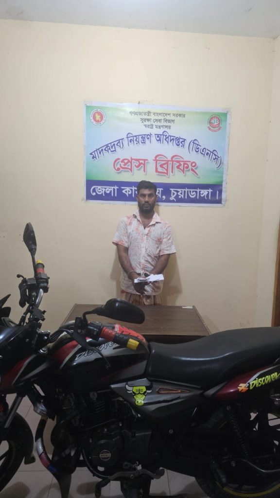 দামুড়হুদা উপজেলার বড় দুধ পাতিলা কবর স্থান সংলগ্ন মন্টুর আম বাগানের সামনে এক ব্যক্তি মোটরসাইকেল নিয়ে যাচ্ছিল। এ সময় মাদকদ্রব্য নিয়ন্ত্রণ অধিদপ্তর আসামি হাবিবুর রহমান মুন্নাকে আটক করা হয়। পরে তার কাছ থেকে উদ্ধার করা হয় ২৫ পিস ইয়াবা, ২০ পিস ট্যাপেন্টাডল ট্যাবলেট ও ১টি মোটরসাইকেল। এ ঘটনায় গ্রেফতারকৃত আসামীর বিরুদ্ধে-উপ পরিদর্শক মোঃ কবির উদ্দিন তালুকদার বাদী হয়ে দামুড়হুদা থানায় একটি মামলা দায়ের করেন।