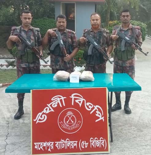 মহেশপুর ৫৮ বিজিবি গণমাধ্যমে পাঠানো এক সংবাদ বিজ্ঞপ্তিতে জানায়, গতকাল মঙ্গলবার সকাল ৬টার দিকে জীবননগর উপজেলার উথলী বিওপি’র সীমান্ত পিলার-৭৫/৫-এস এর নিকট মাঠপাড়া বিলের মধ্যে মাদক বিরোধী অভিযান পরিচালনা করে আসামীবিহীন ৩ কেজি ভারতীয় গাঁজা উদ্ধার করা হয়। একই দিন ভোর সাড়ে ৫টার দিকে জীবননগর নতুনপাড়া বিওপি’র সীমান্ত পিলার-৬৬-এর কাছে নতুন পাড়া গ্রামে অভিযান চালিয়ে আসামীবিহীন ৪৩ বোতল ভারতীয় মদ উদ্ধার করা হয়। এর আগে সোমবার সন্ধ্যা সাড়ে ৭ টার দিকে রাজাপুর বিওপি’র সীমান্ত পিলার-৭৩/১-এস এর কাছে হালদারপাড়া গ্রামে মাদক বিরোধী অভিযান পরিচালনা করে আসামীবিহীন ৩৭০ পিচ ভায়াগ্রা উদ্ধার করা হয়। একই দিন রাত ৮টার দিকে উথলী বিওপি’র সীমান্ত পিলার-৭১/১-এস এর নিকট মনোহরপুর তেতুলতলার মধ্যে হতে নায়েক মোঃ তারিকুর রহমানের নেতৃত্বে মাদক বিরোধী অভিযান পরিচালনা করে আসামীবিহীন ৫০ বোতল ভারতীয় মদ উদ্ধার করা হয়।
