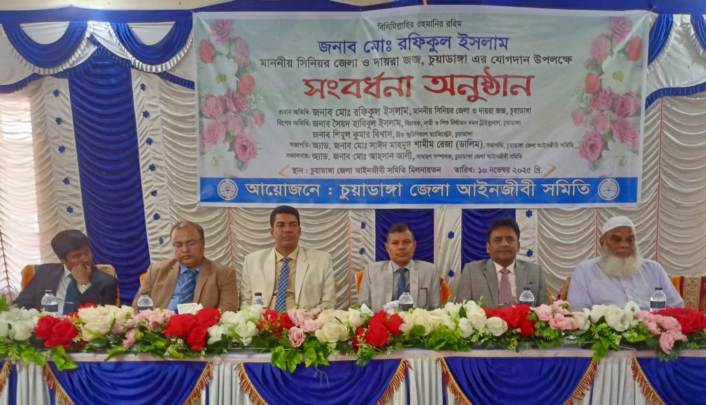 চুয়াডাঙ্গা জেলা আইনজীবী সমিতির সভাপতি সাঈদ মাহমুদ শামীম রেজা ডালিমের সভাপতিত্বে অনুষ্ঠিত সংবর্ধনা সভায় প্রধান অতিথি হিসেবে বক্তব্য রাখেন নবাগত জেলা ও দায়রা জজ মো. রফিকুল ইসলাম। জেলা আইনজীবী সমিতির সাধারণ সম্পাদক মো. আহাসান আলীর সঞ্চালনায় সংবর্ধনা সভায় নারী ও শিশু নির্যাতন দমন ট্র্যাইব্যনালের বিচারক ( জেলা ও দায়রা জজ) সৈয়দ হাবিবুল ইসলাম ও চিফ জুডিসিয়াল ম্যাজিস্ট্রেট শিমুল কুমার বিশ^াস বিশেষ অতিথি হিসেবে বক্তব্য রাখেন। সংবর্ধনা সভায় অতিরিক্ত জেলা ও দায়রা জজ (১) আল আমিন মাতুব্বর , অতিরিক্ত জেলা ও দায়রা জজ (২) মোক্তাদির আলম, যুগ্ম জেলা ও দায়রা জজ (১) ওয়াশিম রেজা , যুগ্ম জেলা ও দায়রা জজ (২) শম্পা বসু, সিভিল জজ (জীবননগর) নাসির হুসাইন, সিনিয়র জুডিসিয়াল ম্যাজিস্ট্রেট (১) আলিফ রহমান, সিনিয়র জুডিসিয়াল ম্যাজিস্ট্রেট (২) ইয়াসমিন নাহার, সিনিয়র জুডিসিয়াল ম্যাজিস্ট্রেট (৩) তৌহিদুল ইসলাম, জুডিসিয়াল ম্যাজিস্ট্রেট (১) লাভলী নাজনিন এবং জুডিসিয়াল ম্যাজিস্ট্রেট (২/৩) মোস্তফা জামান এবং আইনজীবীবৃন্দ উপস্থিত ছিলেন।