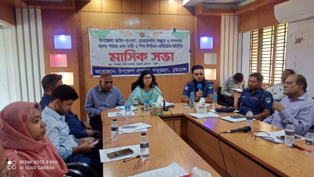 দামুড়হুদায় উপজেলা আইন শৃঙ্খলা, চোরাচালান, সন্ত্রাস ও নাশকতা, মানব পাচার এবং নারী ও শিশু নির্যাতন প্রতিরোধ কমিটির মাসিক সভা অনুষ্ঠিত হয়েছে।গতকাল মঙ্গলবার সকাল সাড়ে ১০ টার সময় উপজেলা প্রশাসনের আয়োজনে পরিষদের সম্মেলন কক্ষে এই মাসিক সভা অনুষ্ঠিত হয়।