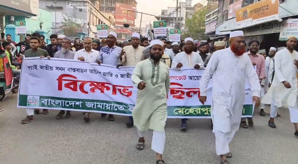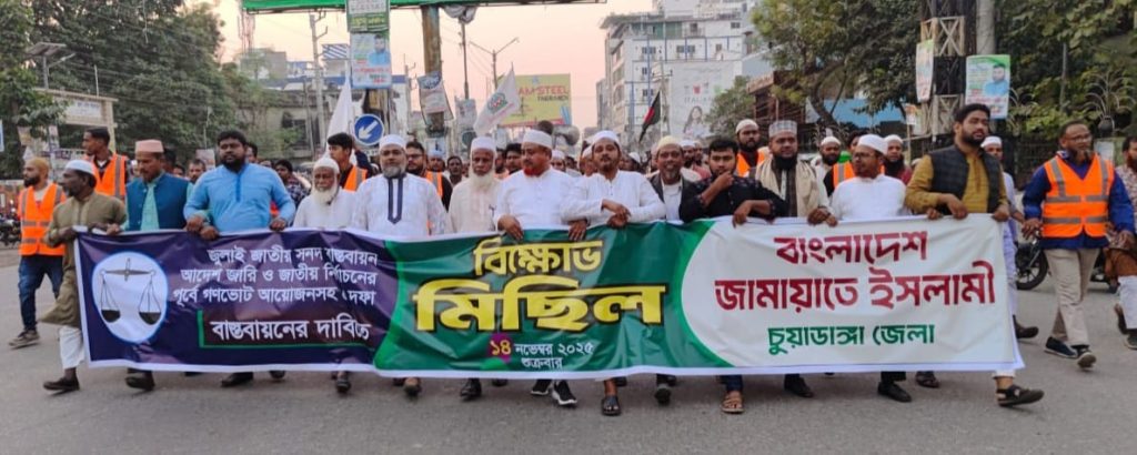 জুলাই জাতীয় সনদ বাস্তবায়নের আদেশ জারি, জাতীয় সংসদ নির্বাচনের আগে গণভোট আয়োজনসহ ৫ দফা দাবিতে চুয়াডাঙ্গা-মেহেরেপুর জামায়াত ইসলামী বিক্ষোভ মিছিল করেছে। পাঁচ দফা দাবি বাস্তবায়ন না হলে আন্দোলন অব্যাহত থাকবে বলে জানান নেতারা। গতকাল শুক্রবার বিকেলে জেলা জামায়াতের আয়োজনে এ বিক্ষোভ মিছিল ও সমাবেশ অনুষ্ঠিত হয়। বিক্ষোভ মিছিল ও সমাবেশে দলীয় নেতাকর্মীরা অংশগ্রহণ করেন। চুয়াডাঙ্গা টাউন ফুটবল মাঠ থেকে বিক্ষোভ মিছিল বের হয়ে শহরের গুরুত্বপূর্ণ সড়ক ঘুরে একই স্থানে এসে শেষ হয়।