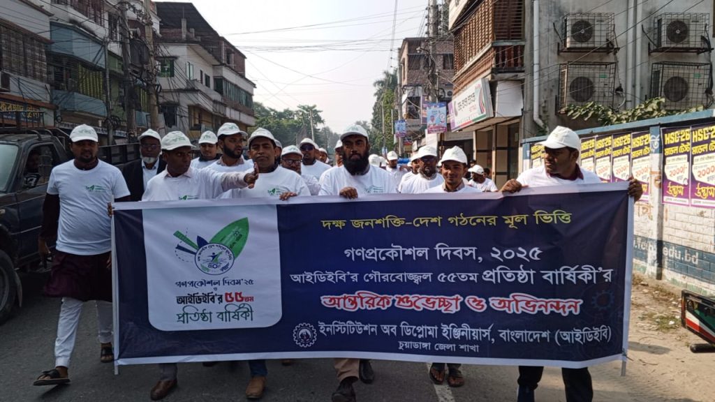 ‘দক্ষ জনশক্তি -দেশ গঠনের মূল ভিত্তি’ এই প্রতিপাদ্যকে সামনে রেখে চুয়াডাঙ্গায় ইনস্টিটিউশন অব ডিপ্লোমা ইঞ্জিনিয়ার্স বাংলাদেশ এর ৫৫তম প্রতিষ্ঠাবার্ষিকী পালিত হয়েছে। গণপ্রকৌশল দিবস ২০২৫ উপলক্ষে চুয়াডাঙ্গায় বর্ণাঢ্য র্যালি ও আলোচনা সভা অনুষ্ঠিত হয়েছে। সকাল ১০ টায় চুয়াডাঙ্গা পুরাতন হাসপাতাল পাড়া আইডিইবি কার্যালয়ে এ প্রতিষ্ঠা বার্ষিকী পালিত হয়। কার্যালয়ের সামনে থেকে সকাল ১০টায় একটি বর্ণাঢ্য র্যালি বের হয়। র্যালিটি শহরের বড়বাজার হাসান চত্বর হয়ে কবরী রোড হয়ে কোটমোড় ঘুরে আবার একই স্থানে এসে শেষ হয়। র্যালি শেষে আইডিবির কার্যালয়ে এক আলোচনা সভা অনুষ্ঠিত হয়।