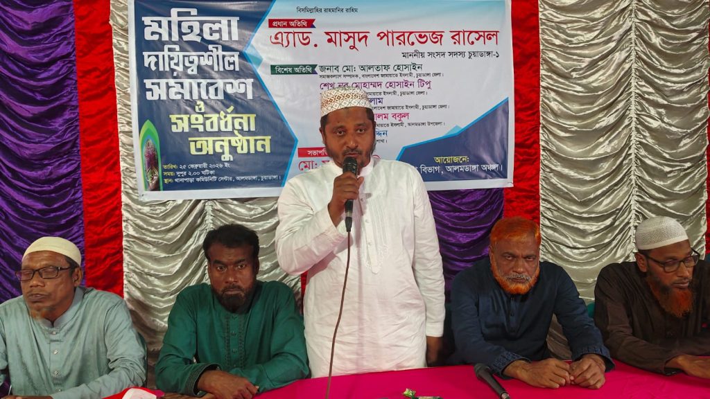 ইফতার মাহফিলে স্থানীয় মুসল্লি ও এলাকাবাসীর স্বতঃস্ফূর্ত অংশগ্রহণে ধর্মীয় পরিবেশের মধ্য দিয়ে অনুষ্ঠান সম্পন্ন হয়। এর আগে বেলা দুইটায় আলমডাঙ্গা থানাপাড়ায় একটি কমিউনিটি সেন্টারে মহিলা সমাবেশ অনুষ্ঠিত হয়। উক্ত সমাবেশে সভাপতিত্ব করেন আলমডাঙ্গা পৌর আমীর মাহের আলী ও অনুষ্ঠান পরিচালনা করেন সেক্রেটারি মুসলিম উদ্দিন। প্রধান অতিথির বক্তব্যে চুয়াডাঙ্গা -১ আসনের সদস্য মাসুদ রাসেল বলেন, আমরা কেন্দ্রকে বুঝাতে সক্ষম হয়েছি, মহিলা অঙ্গনে যেখানে আমাদের পকেটের টাকা খরচ করে, বাড়ি ঘর রেখে যে পরিশ্রম করেছেন। আমি আপনাদের প্রতি কৃতজ্ঞ। সমাবেশে আরো উপস্থিত ছিলেন যুব বিভাগের সভাপতি নুর মোহাম্মদ হোসাইন টিপু বিষয়ক সম্পাদক দারুস সালাম সমাজকল্যাণ সম্পাদক আলতাফ হোসেন, উপজেলা আমীর সফিউল আলম বকুল ও গাংনী-আসমানখালী আমির আব্বাস উদ্দিন প্রমুখ