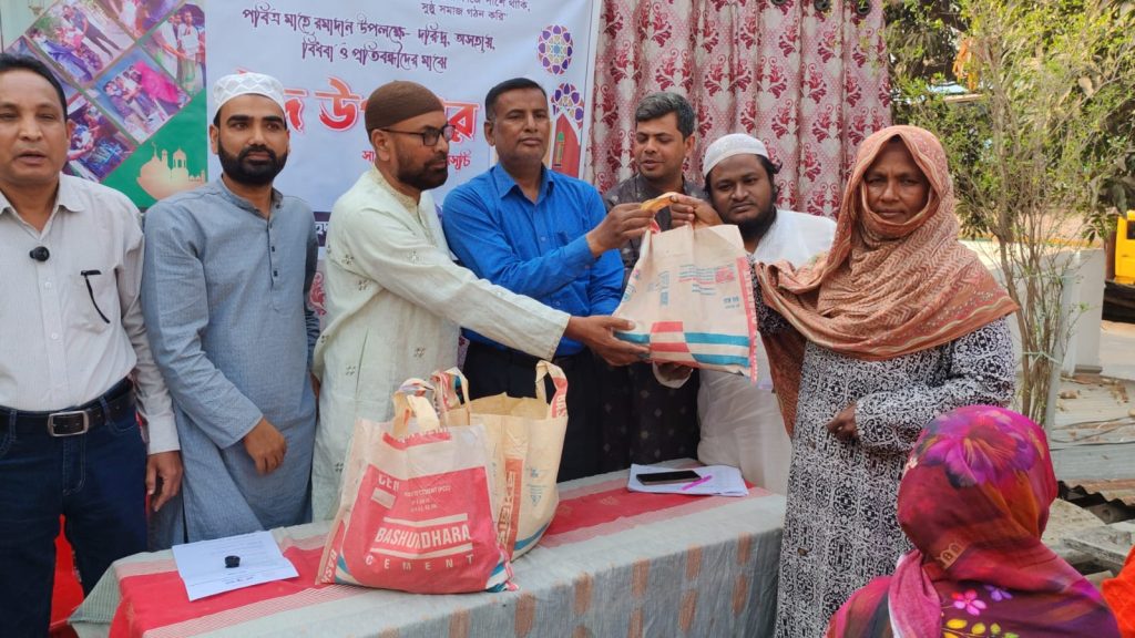 ,মসলা,তেজপাতা,ডালডা,আলু ঈদ উপহার সামগ্রী বিতরণ করা হয়।