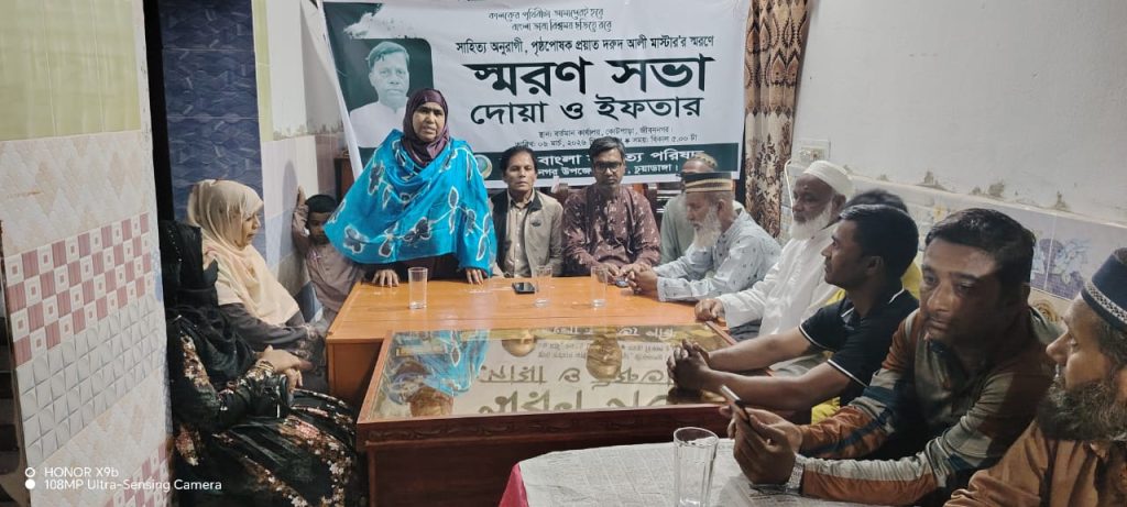 সাহিত্য অনুরাগী, পৃষ্ঠপোষক প্রয়াত দরুদ আলী মাস্টারের স্মরণ সভা বিশ্ব বাংলা সাহিত্য পরিষদ জীবননগর উপজেলা শাখার উদ্যোগে অনুষ্ঠিত হয়েছে। গতকাল শুক্রবার বিকাল ৫টায় কোর্ট পাড়ার বর্তমান কার্যালয়ে স্মরণ সভা অনুষ্ঠিত হয়। স্মরণ সভা শেষে বিশেষ দোয়া ও ইফতার মাহফিল অনুষ্ঠিত হয়। স্মরণ সভায় সভাপতিত্ব করেন সাপ্তাহিক জীবননগর বার্তার সম্পাদক ও দৈনিক আজকের চুয়াডাঙ্গা পত্রিকার জীবননগর ব্যুরো প্রধান শামসুল আলম। স্মরণ সভায় দরুদ আলীর বর্ণাঢ্য জীবন নিয়ে আলোচনা করেন, জেলা প্রাথমিক শিক্ষক সমিতির সভাপতি সোয়াইব হোসেন, বিশ্ব বাংলা সাহিত্য পরিষদ জীবননগর উপজেলা শাখার সভাপতি আশরাফুন নাহার শোভা, দামুড়হুদা সাহিত্য পরিষদের সাধারণ সম্পাদক আব্দুল আলীম, দর্শনা সাহিত্য পরিষদের আহবায়ক মুরসিদ আলম, বিশ্ব বাংলা সাহিত্য পরিষদ জীবননগর উপজেলা শাখার সাধারণ সম্পাদক মিজানুর রহমান সুনু, অবসর প্রাপ্ত শিক্ষক সুজাউল হক, প্রয়াত দরুদ আলীর কন্যা তাসনুভা সামাররুখ নৈঋত। উপস্থিত ছিলেন, জীবননগর সাংবাদিক সমিতির সভাপতি আতিয়ার রহমান, জীবননগর প্রেসক্লাবের সাধারণ সম্পাদক রিপন হোসেন, অ্যাড. আশিকুর রহমান রাজ, সাংবাদিক তারিকুর রহমান, রকিবুজ্জামান, টিপু সুলতান, মোস্তাফিজুর রহমান, কবি শফিকুল ইসলাম রাজু, কবির আল চপল, রানা হামিদ, হারুন অর রশিদ, রাজিম হোসেন, মোবাশ্বিও হোসেন, নাজমুল সবুর প্রমুখ। অনুষ্ঠান সঞ্চালনা করেন হারুন অর রশিদ।