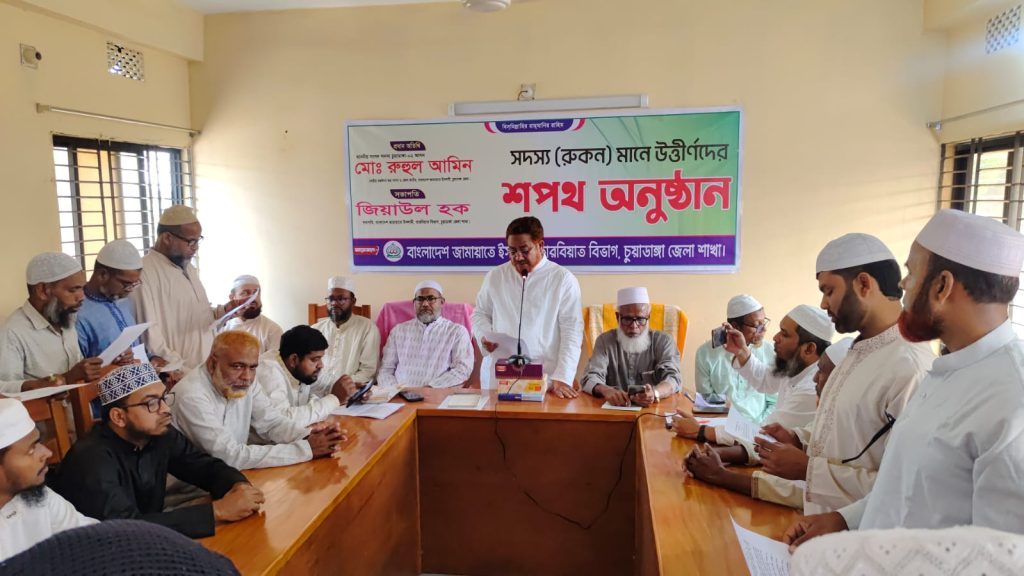 চুয়াডাঙ্গায় জামায়াতের ৩৮ জন নারী-পুরুষ রুকন শপথ নিলেন। গতকাল বুধবার বেলা ২ টায় দলীয় কার্যালয়ে এ শপখ অনুষ্ঠিত হয়। জেলা প্রশিক্ষণ বিভাগের সভাপতি জিয়াউল হকের সভাপতিত্বে অনুষ্ঠানে প্রধান অতিথি ছিলেন চুয়াডাঙ্গা-২ আসনের এমপি ও দলের জেলা আমীর রুহুল আমিন।