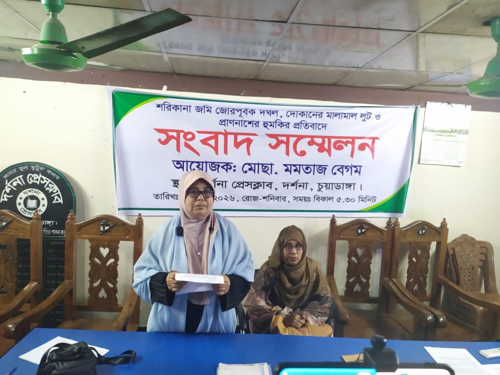 পৈত্রিক সম্পত্তিতে নিজের প্রাপ্য অংশে দোকান নির্মাণের পর সেই সম্পত্তি দখল নিতে আপন ভাইদের বিরুদ্ধেই অভিযোগ তুলেছেন এক বোন। শুধু দখলচেষ্টাই নয়, দোকানের তালা ভেঙে প্রায় ১০ লক্ষ টাকার মালামাল লুট এবং প্রতিবাদ করায় প্রাণনাশের হুমকির অভিযোগ এনে সংবাদ সম্মেলন করেছেন আপন বোন মমতাজ বেগম। গতকাল শনিবার বিকালে দর্শনা প্রেসক্লাবে আয়োজিত সংবাদ সম্মেলনে লিখিত বক্তব্যে তিনি এসব অভিযোগ তুলে ধরেন।