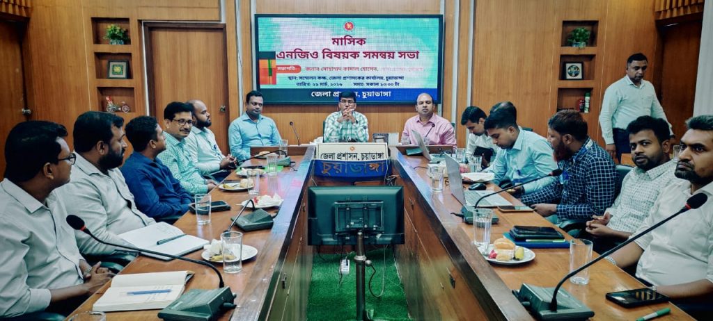 চুয়াডাঙ্গায় এনজিওগুলোর উন্নয়নমূলক কর্মকাণ্ডে গতিশীলতা আনয়ন এবং সরকারি-বেসরকারি কাজের সমন্বয় সাধনের লক্ষ্যে মাসিক এনজিও বিষয়ক সমন্বয় সভা অনুষ্ঠিত হয়েছে। গতকাল রবিবার সকাল ১০টায় জেলা প্রশাসকের কার্যালয়ের সম্মেলন কক্ষে এই সভা অনুষ্ঠিত হয়। সহকারী কমিশনার (নির্বাহী ম্যাজিস্ট্রেট) আশফাকুর রহমানের সঞ্চালনায় সভায় সভাপতিত্ব করেন চুয়াডাঙ্গা জেলা প্রশাসক মোহাম্মদ কামাল হোসেন। এসময় জেলায় কর্মরত বিভিন্ন জাতীয় ও স্থানীয় এনজিওর প্রতিনিধিরা তাদের বিগত মাসের কাজের অগ্রগতি এবং আগামী মাসের কর্মপরিকল্পনা উপস্থাপন করেন।