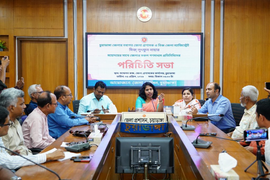 তিনি আরো বলেন, জেলার ইটভাটা গুলো মাটি টানার কারণে রাস্তায় মাটি পড়ে যে চলাচলে বিঘ্ন ঘটে সেটির বিরুদ্ধেও ব্যবস্থা গ্রহণ করা হবে। চুয়াডাঙ্গার প্রধান নদী মাথাভাঙ্গা ও শাখা নদী নবগঙ্গা দূষণ রোধে পৌরসভা কে দায়িত্ব দেওয়া হয়েছে পরবর্তীতে এর ফিডব্যাক নেওয়া হবে। চুয়াডাঙ্গা জেলার বড়বাজারের রাস্তা দখল মুক্ত করতে ব্যবস্থা গ্রহণ করা হবে। জেলার সার্বিক উন্নয়নে সকলকে সহায়তার হাত বাড়িয়ে দিতে হবে। আমরা যেহেতু প্রশাসনের আছি আমাদের নিজস্ব কোন সোর্স নেই। আপনারা সাংবাদিকরা আমাদেরকে তথ্য দিয়ে সহায়তা করবেন। কোথাও কোন অনিয়ম বা অসঙ্গতি হলে আমাদেরকে জানাবেন আমরা তৎক্ষণাৎ ব্যবস্থা গ্রহণ করব।