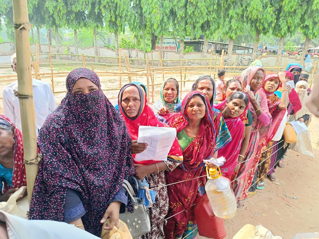 সন্ধ্যা রানী বলেন, আমার বাড়ির একজন অসুস্থ। রোদে দীর্ঘ সময় দাঁড়ালে তার সমস্যা বাড়বে। তাই আমি নিজেই তেল নিতে এসেছি।