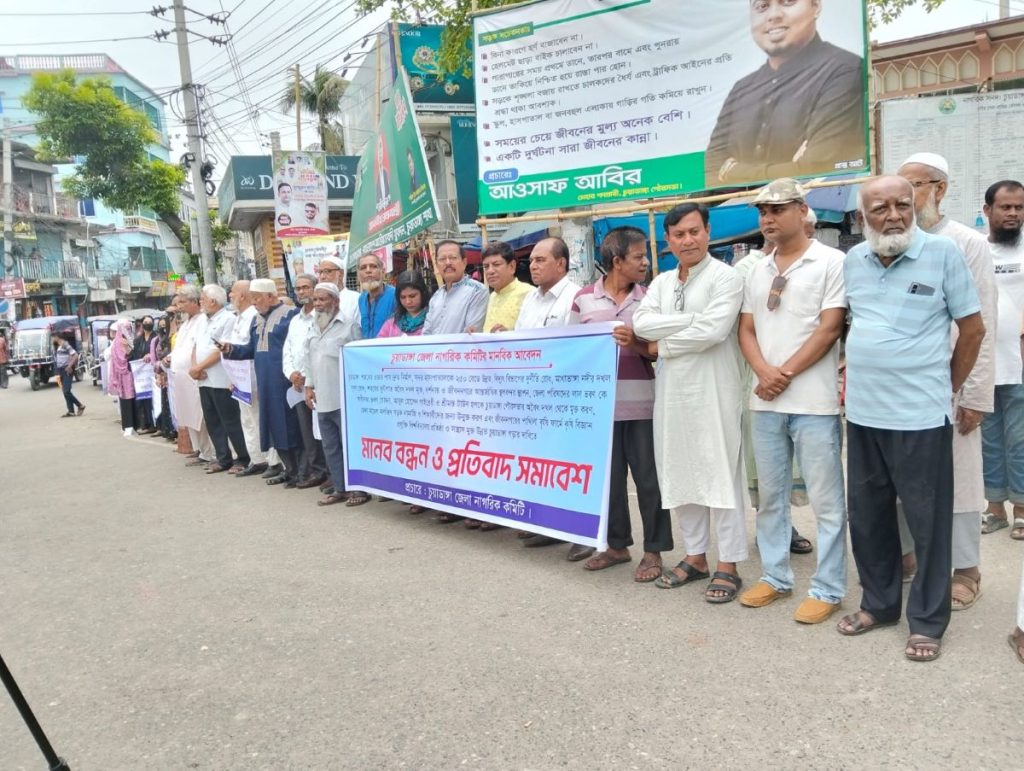 জেলার বিভিন্ন নাগরিক সমস্যা সমাধানের দাবিতে চুয়াডাঙ্গা জেলা নাগরিক কমিটির উদ্যোগে এক মানববন্ধন ও প্রতিবাদ সমাবেশ অনুষ্ঠিত হয়েছে| গতকাল সোমবার সকাল সাড়ে ৯টার চুয়াডাঙ্গার বড়বাজারের শহীদ হাসান চত্বর মোড়ে এ কর্মসূচি শান্তিপূর্ণভাবে সম্পন্ন হয়| মানববন্ধনে সভাপতিত্ব করেন চুয়াডাঙ্গা জেলা নাগরিক কমিটির সভাপতি মোঃ তৌহিদ হোসেন|