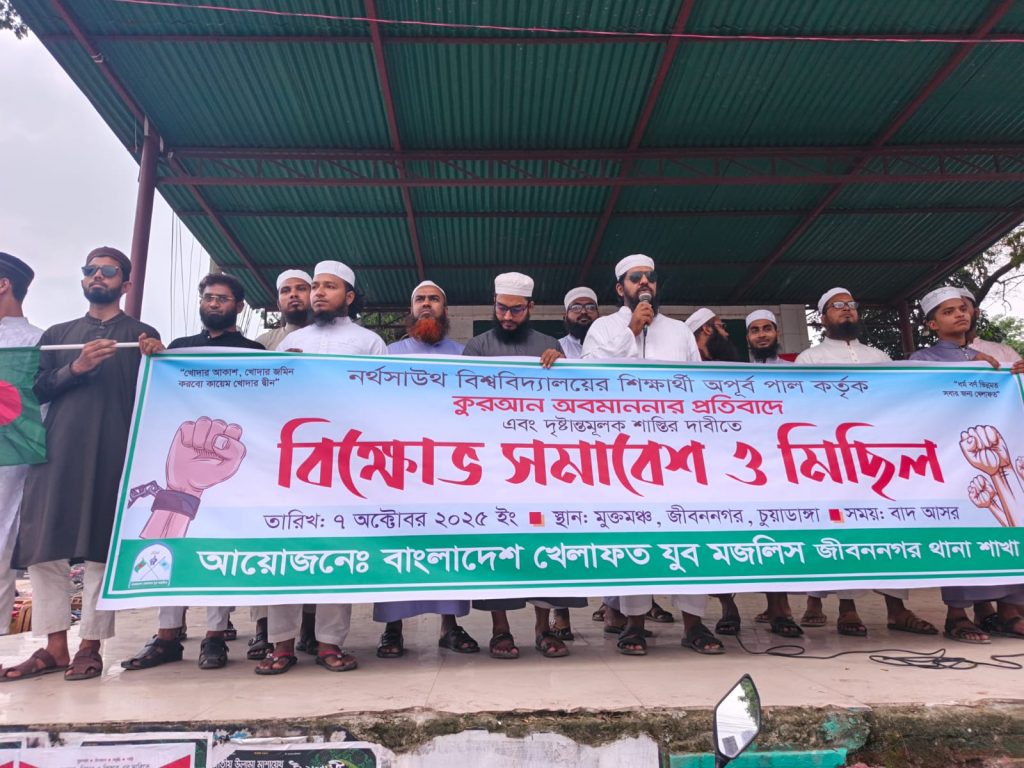 নর্থসাউথ বিশ্ববিদ্যালয়ের শিক্ষার্থী অপূর্ব পাল কর্তৃক পবিত্র কুরআন অবমাননার প্রতিবাদ ও শাস্তির দাবিতে জীবননগরে বিক্ষোভ সমাবেশ